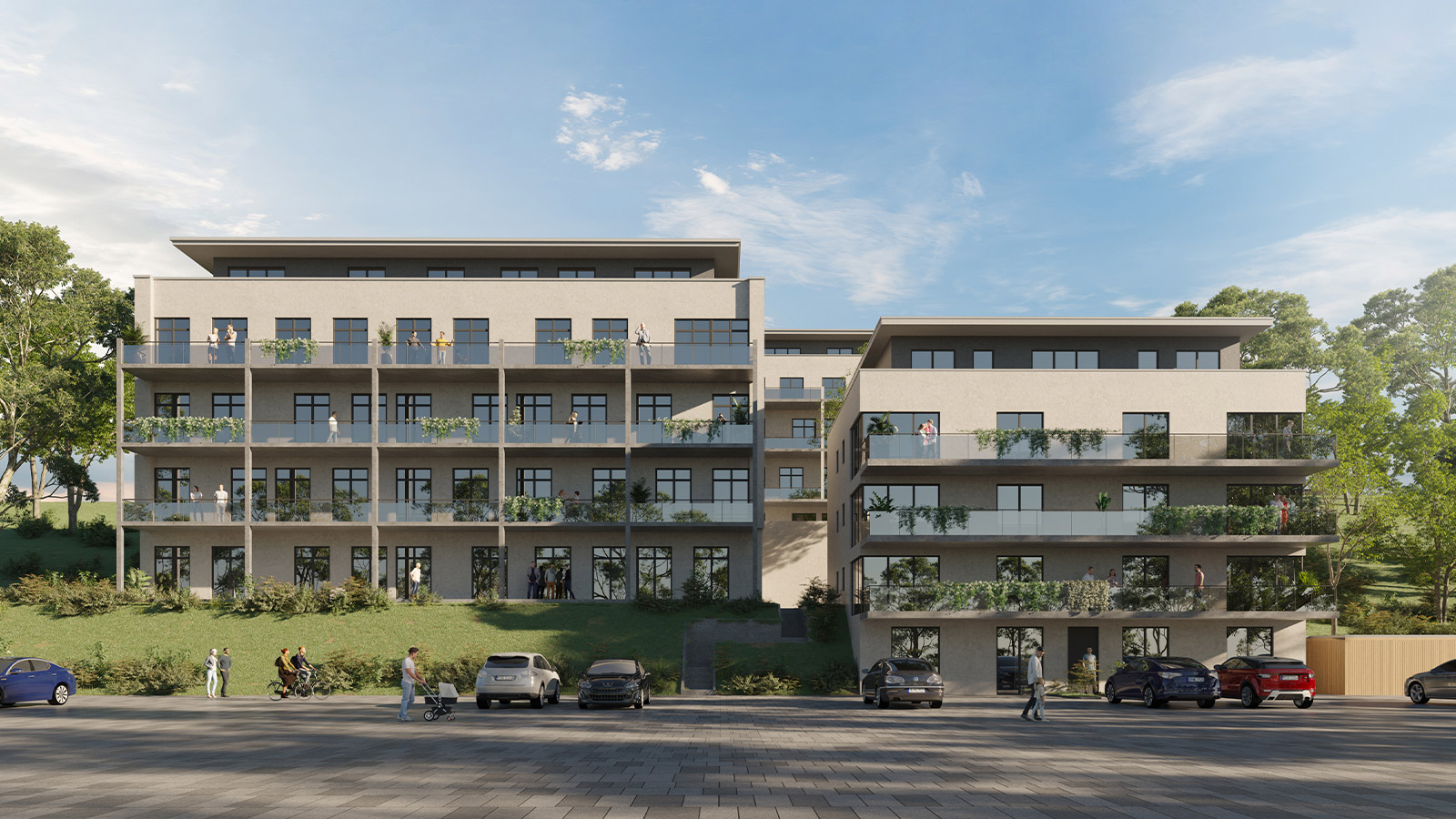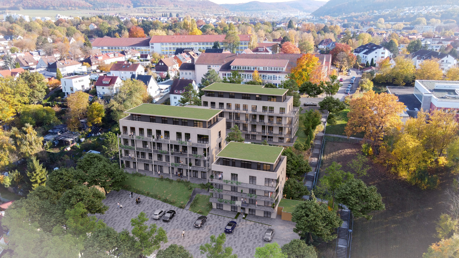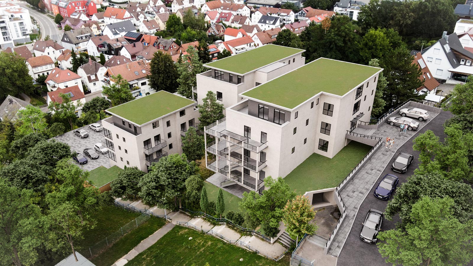In Aalen hat R&V zwei alte Gebäude komplett saniert und in schicke Eigentumswohnungen umgebaut. Zusätzlich wurde ein drittes freistehendes Gebäude konzipiert und geplant. Während die beiden ursprünglichen Gebäude mit Außen-Stellplätzen angeboten werden, wurde bei der Planung des Neubaus bereits eine ebenerdig liegende Garage in Auftrag gegeben. Die gesamte Visualisierung der Gebäude und der Umgebung hat PLANWERK3D dabei übernommen.
