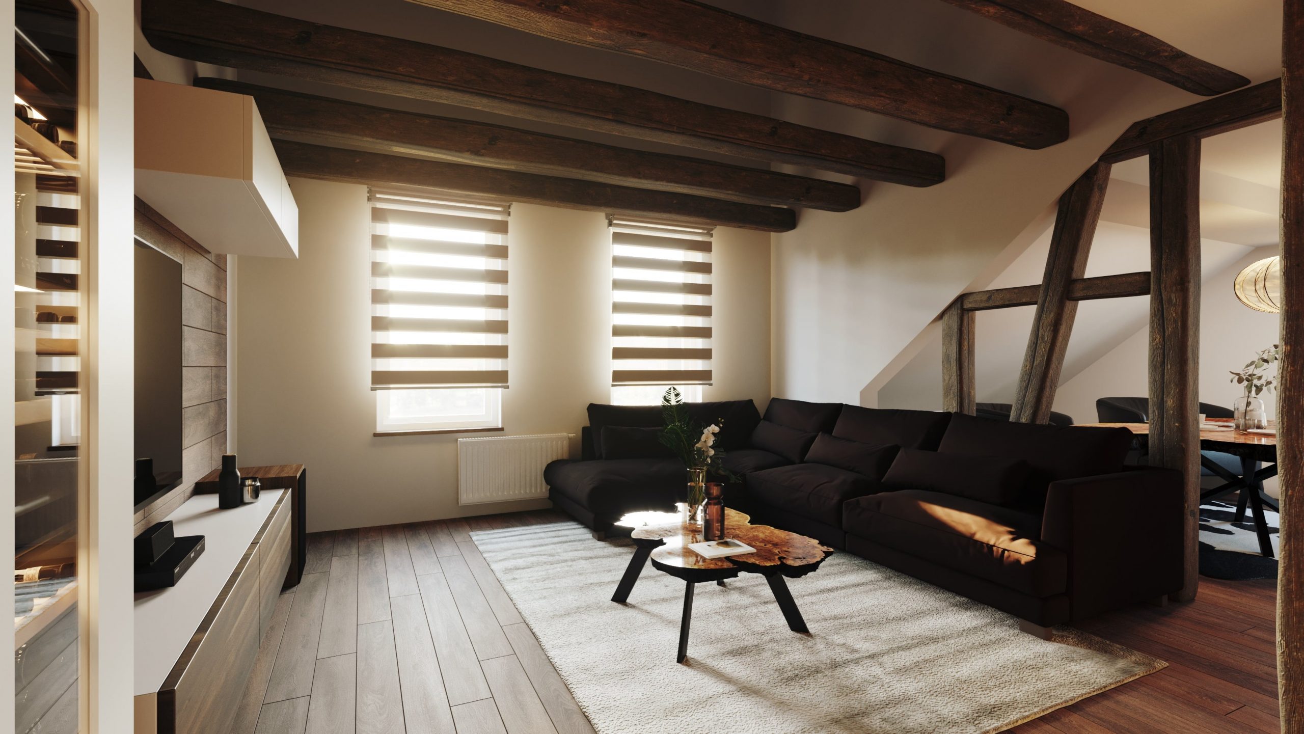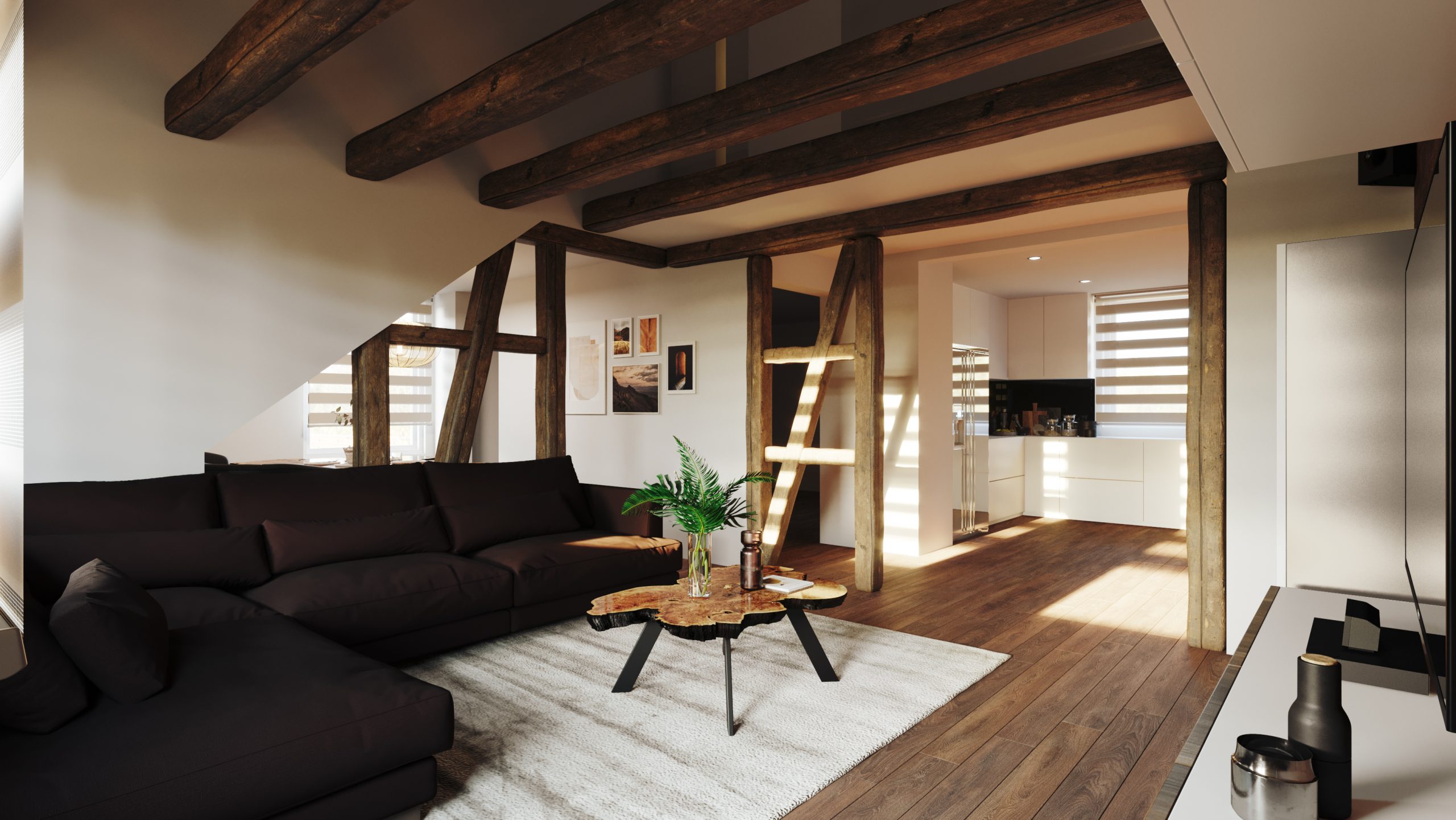 Das alte Fachwerk wurde erhalten und in den Vordergrund gehoben, abgerundet wurde das Objekt mit klassischem Holzboden, beigen, braunen und weißen Farbtönen sowie ausgewählten Echtholzmöbel von Dévotion.