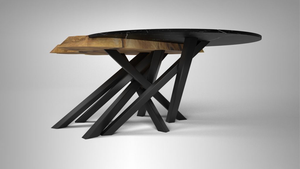 Wir visualisieren Ihnen auch individuell gestaltete Tische wie hier ein Zusammenspiel aus naturbelassenem Edelholz in Kombination mit einer cleanen Epoxidharzfüllung…